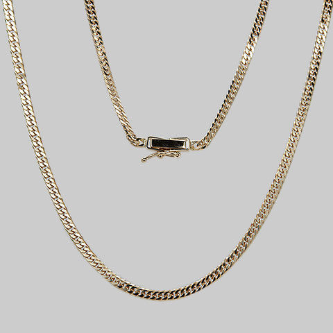 喜平デザインは世界的に人気が高く20代から年齢問わないネックレスやブレスレットです。昔より金は不変の輝きを放ち、富の象徴、成功の証とされてきました。また、使用される貴金属の品質は経済的価値が非常に高く、いつでも換金対象としても安定した投資対象ともされています。なかでも、K18ダブル6面喜平はボリューム感と強度の点で人気が高く、着用に相応しい日常づかいのネックレスです。製造は日本で、留め具は中折れ金具セフティー付きです。また、中折れ金具の外側に日本造幣局の刻印が打刻しており、その純度を保証されています。(純金喜平の一部はヒキワ金具です)